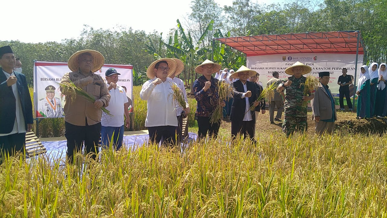 REPORTIKANEWS.COM-Bupati Sukabumi Marwan Hamami dampingi Kepala Kantor Perwakilan Bank Indonesia (BI) Jawa Barat, dalam Panen Raya yang berlangsung di Pondok Pesantren Assalam Putri, Jumat (12/5/23).