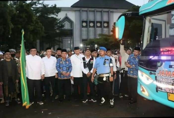 REPORTIKANEWS.COM-Bupati Sukabumi H. Marwan Hamami lepas keberangkatan 440 jemaah calon haji kloter 68, di Pusabangdai Kecamatan Cikembar Kabupaten Sukabumi, Jawa Barat, Senin (19/6/23).
