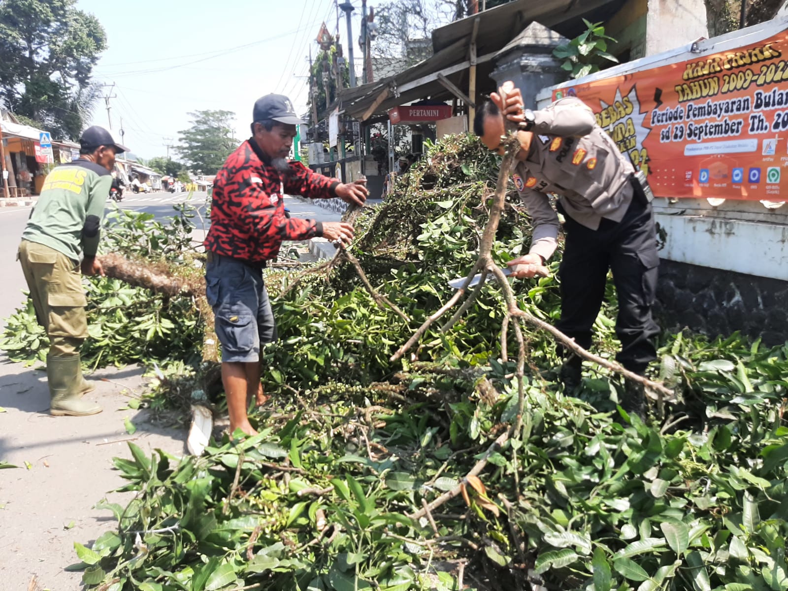 Bhabinkamtibmas Polsek Lembursitu Bripka Faisal bersama warga setempat membersihkan dan memotong pohon yang dianggap membahayakan bagi pengguna jalan.