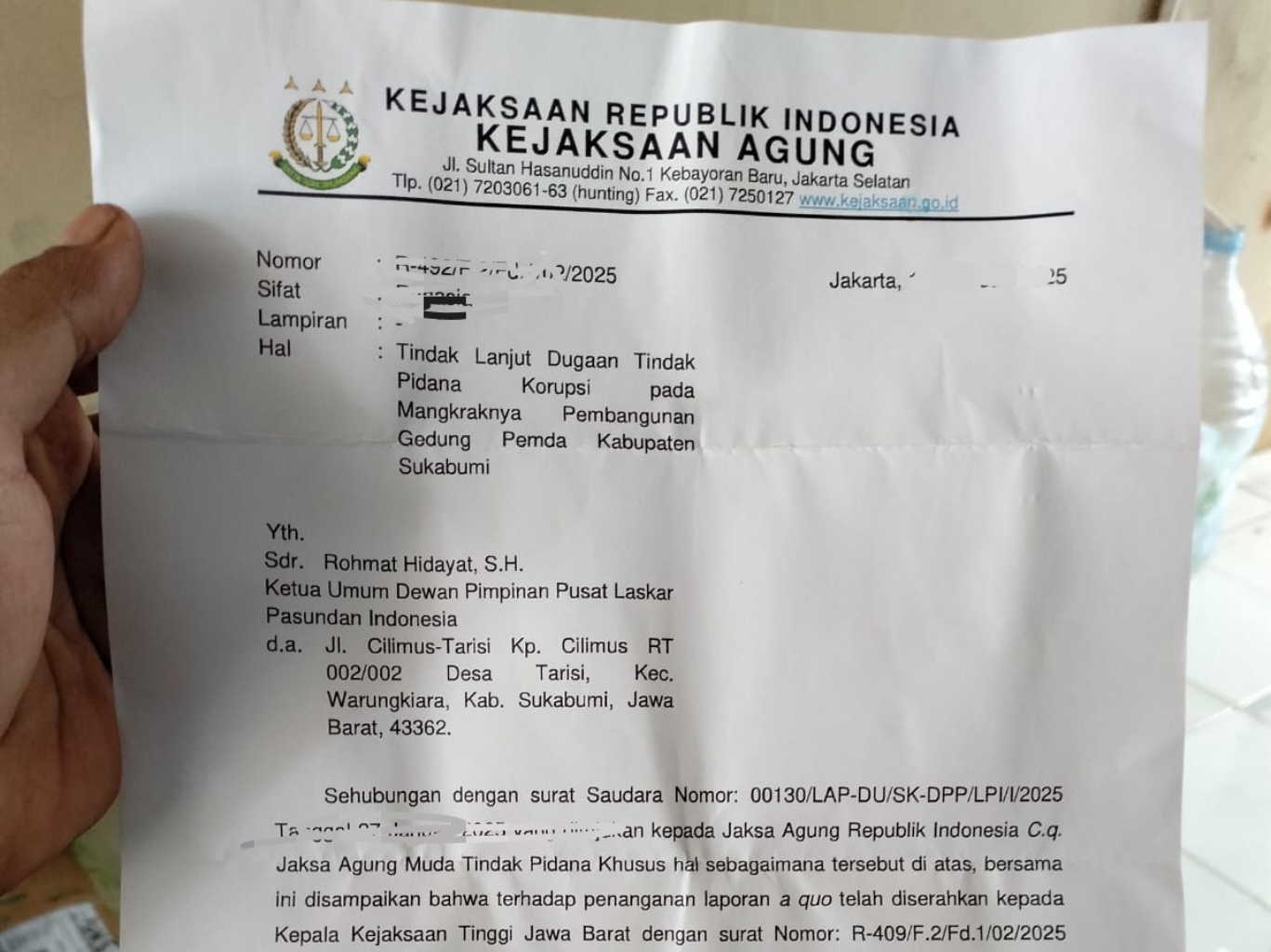 Mangkraknya Gedung Pemda ke Kejaksaan Agung Republik Indonesia (Kejagung RI) dengan nomor surat : 00130/LAP-DU/SK-DPP/LPI/I/2025 dan mendapatkan surat balasan dari kejaksaan agung dengan nomor surat : SR-492/F.2/Fd.1/2/2025.