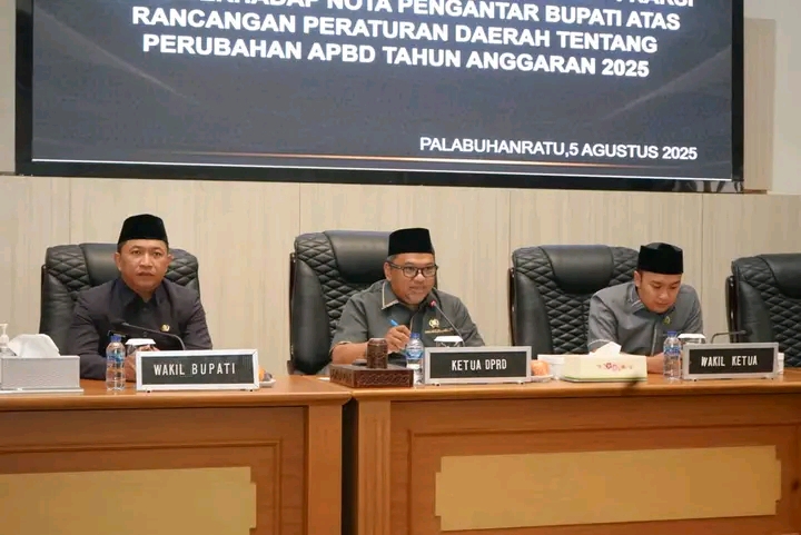 REPORTIKANEWS.COM – DPRD Kabupaten Sukabumi kembali gelar Sidang Rapat Paripurna dalam agenda penyampaian pandangan umum Fraksi Fraksi DPRD, Terhadap nota pengantar Bupati atas Rancangan Peraturan Daerah (Raperda) tentang perubahan APBD tahun anggaran 2025, Sidang Paripurna berlangsung di Ruang Rapat DPRD Kabupaten sukabumi, Selasa (05/08/2025).