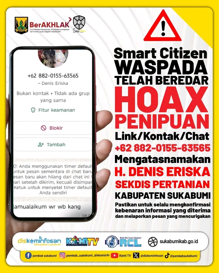 REPORTIKANEWS.COM – Waspada Hoaks dan Penipuan Digital beredar mengatasnamakan Denis Eriska Sekretaris Dinas (Sekdis) Pertanian Kabupaten Sukabumi, Mimggu (30/11/2025).