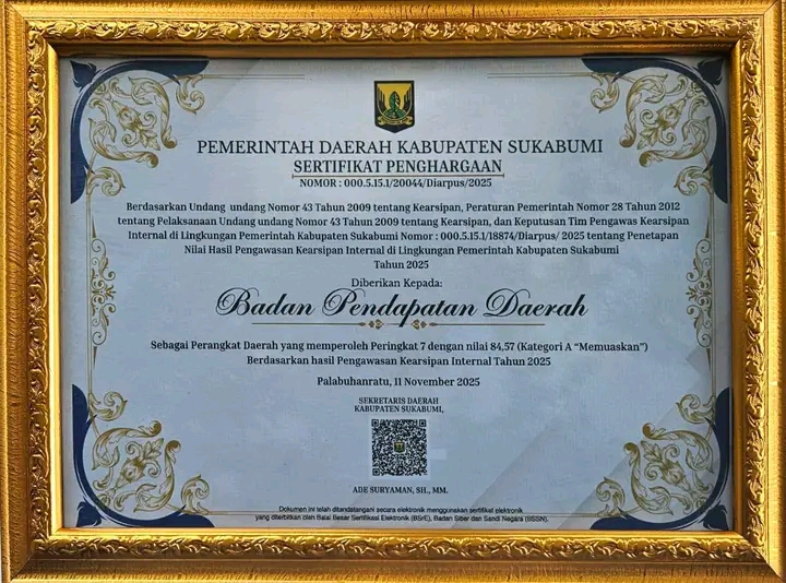 REPORTIKANEWS.COM – Pemerintah Kaupaten (Pemkab) Sukabumi memberikan penghargaan kepada Badan Pendapatan Daerah (Bapenda) salah satu perangkat daerah yang mendapatkan penghargaan dengan nilai 84,57 dengan kategori A “Memuaskan”. Bapenda dinilai melakukan pengelolaan kearsipan dengan baik.